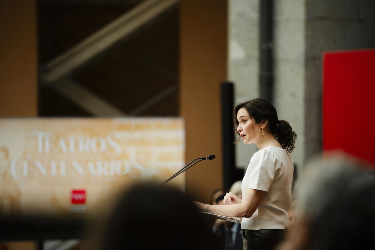 La presidenta de la Comunidad de Madrid, Isabel Díaz Ayuso (c), durante el acto homenaje a los 21 teatros centenarios de la región, en la Real Casa de Correos, a 27 de marzo de 2026, en Madrid (España). El homenaje coincide con la celebración del Día Mund - Mateo Lanzuela - Europa Press