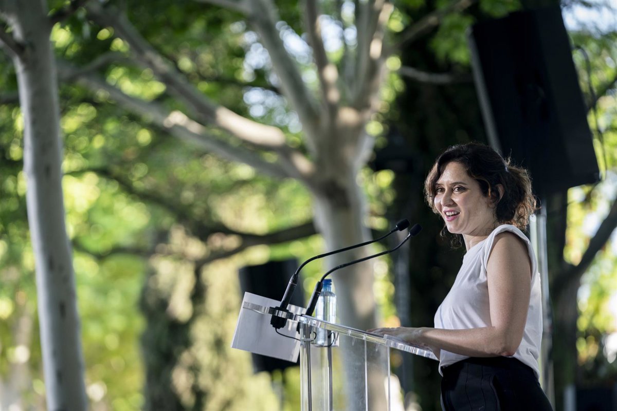 La presidenta de la Comunidad de Madrid, Isabel Díaz Ayuso, interviene durante un acto de campaña del partido, en el Parque Finca Liana, a 28 de mayo de 2024, en Madrid (España). - A. Pérez Meca - Europa Press