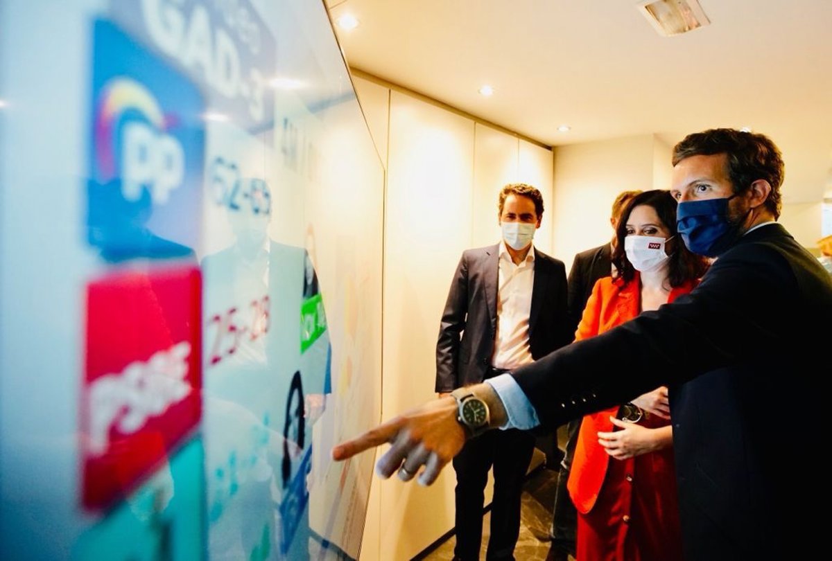 La dirigente madrileña seguirá el escrutinio desde la primera planta del edificio, la que corresponde el PP regional, mientras que el presidente del partido, Pablo Casado, lo hará en la séptima.