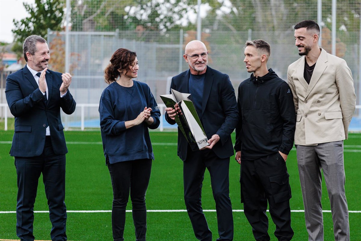 Este galardón se lo ha entregado al seleccionador Luis de la Fuente y a los jugadores Joselu Mato y Alejandro Grimaldo en el municipio madrileño de Villamanta, que sufrió el pasado año las consecuencias de una DANA. Allí, además, ha inaugurado las nuevas instalaciones deportivas que quedaron debastadas.