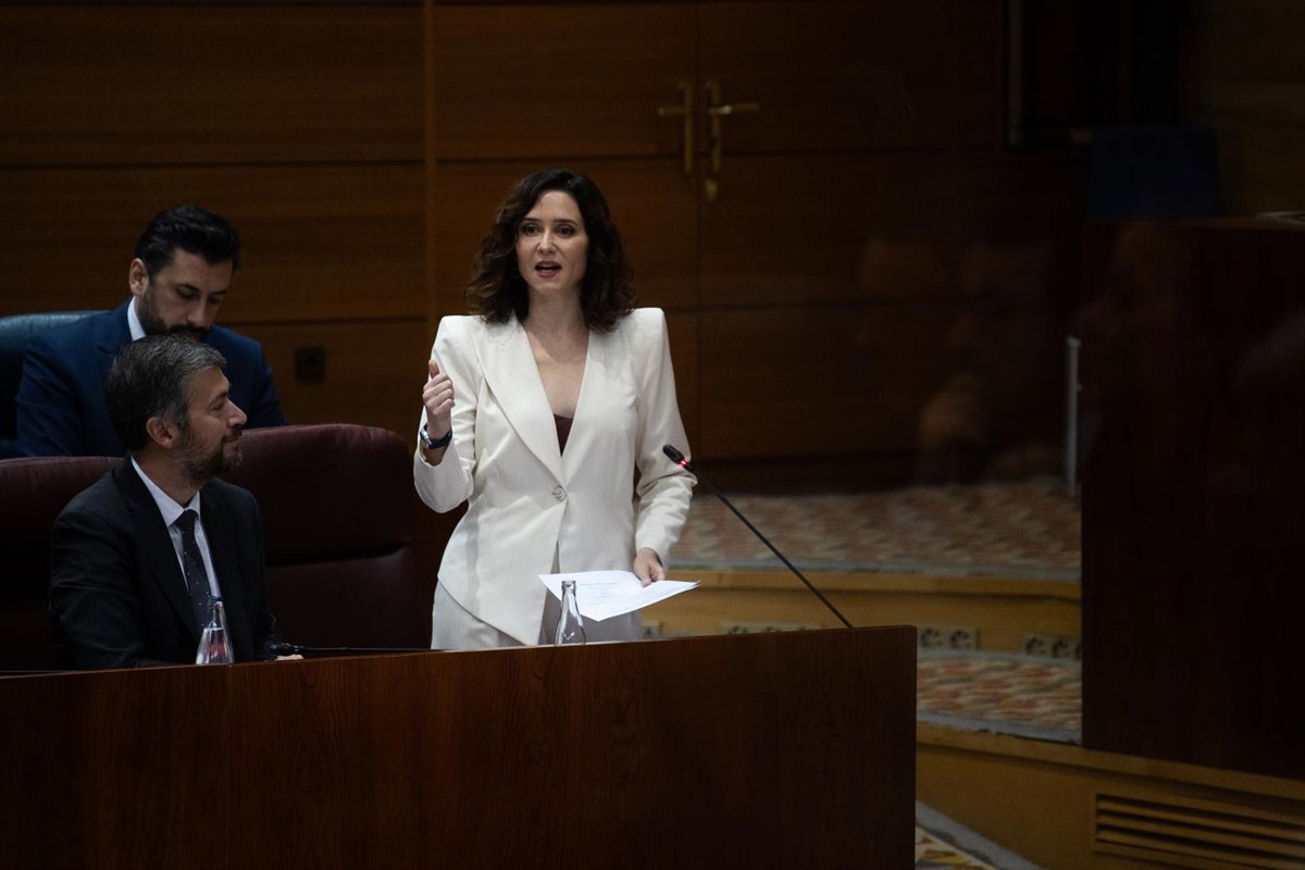 La presidenta de la Comunidad de Madrid, Isabel Díaz Ayuso, interviene durante un pleno en la Asamblea de Madrid, a 24 de abril de 2025, en Madrid (España). - Alejandro Martínez Vélez - Europa Press