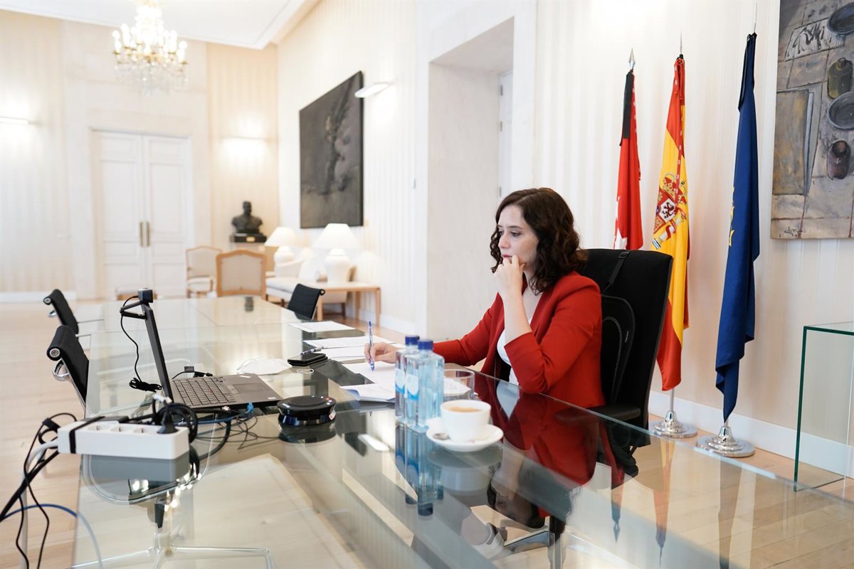 La presidenta de la Comunidad de Madrid, Isabel Díaz Ayuso, asiste a la reunión por videoconferencia del presidente del Gobierno, Pedro Sánchez, con los presidentes autonómicos, en Madrid (España) a 7 de julio de 2020. - Comunidad de Madrid