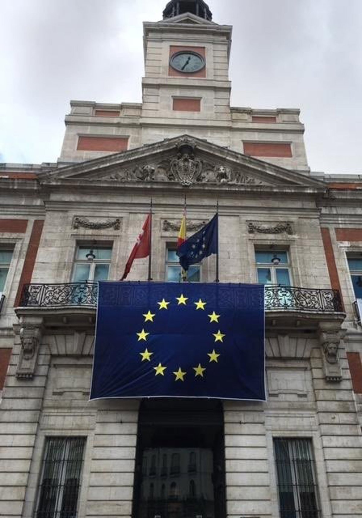 La Comunidad de Madrid se ha sumado a la celebración del Día de Europa que se conmemora este lunes, día 9 de mayo, con la colocación de una bandera de la Unión Europea en la Real Casa de Correos, sede del gobierno regional.