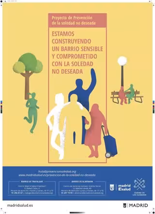 En cada uno de los actos informativos se presentará también el material que se utilizará en la campaña de difusión: vídeo, dípticos, carteles y pegatinas para los establecimientos que entren a formar parte de la red informal de apoyo, con lemas del tipo 'Aquí colaboramos con el proyecto de prevención de la soledad no deseada', 'Estamos construyendo un barrio sensible y comprometido con la soledad no deseada', o 'Porque la soledad es un problema común, la mejor forma de hacerle frente es entre todos y todas'.
