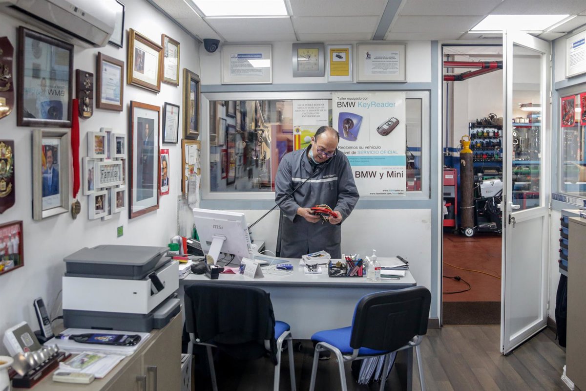 Archivo - Un trabajador responde al teléfono en talleres Otman, en el polígono industrial Ventorro del Cano en Alcorcón. - Ricardo Rubio - Europa Press - Archivo