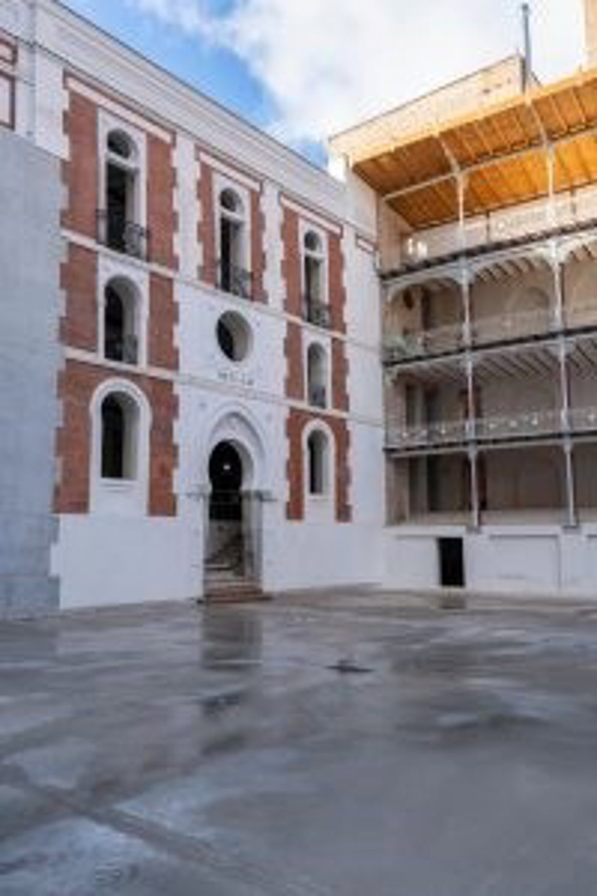 Fachada interior del frontón, antes y después / Ferrovial