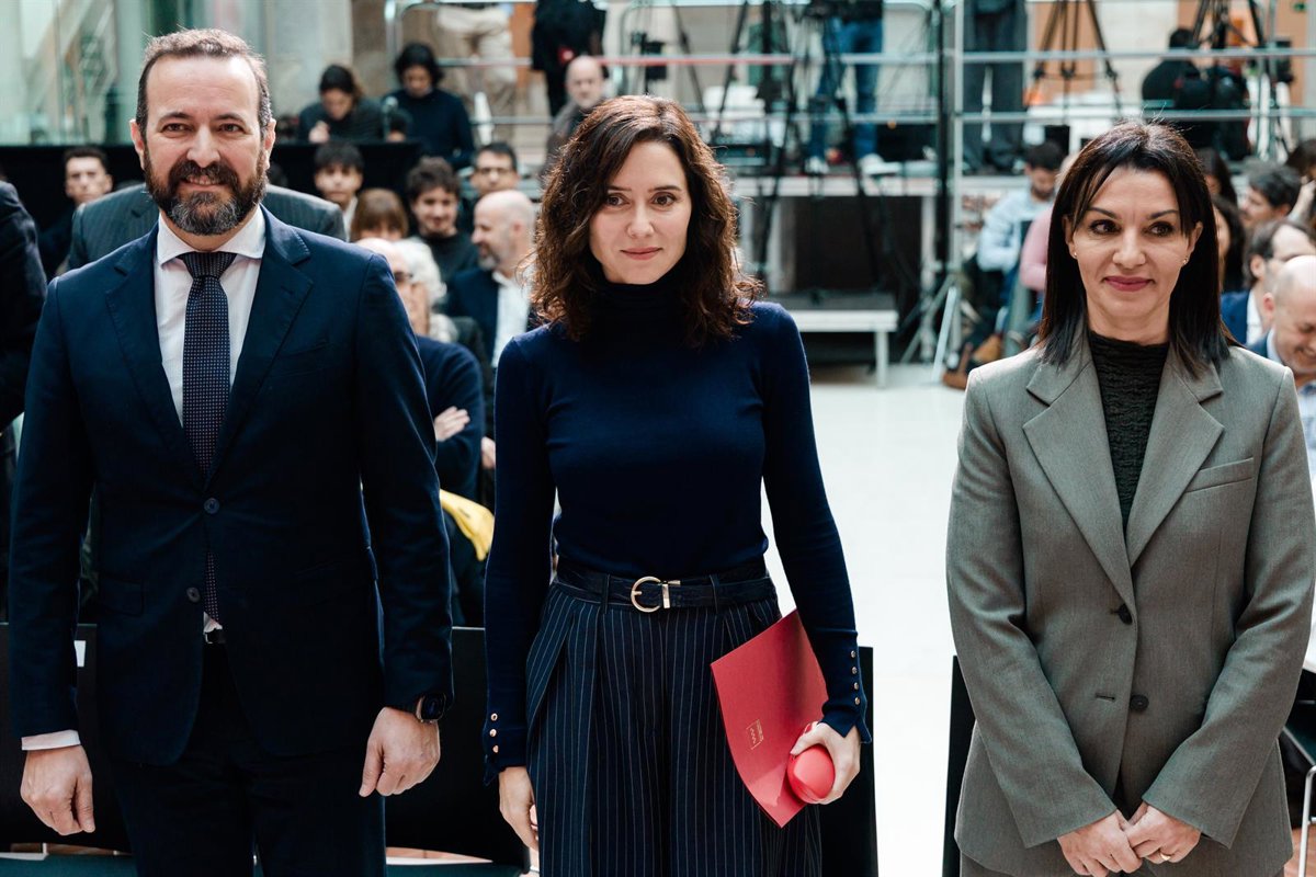 El viceconsejero de Política y Organización Educativa, José Carlos Fernández Borreguero, la presidenta de la Comunidad de Madrid, Isabel Díaz Ayuso, y la viceconsejera de Universidades, Investigación y Ciencia, Mercedes Zarzalejo Carbajo, durante el acto - Carlos Luján - Europa Press