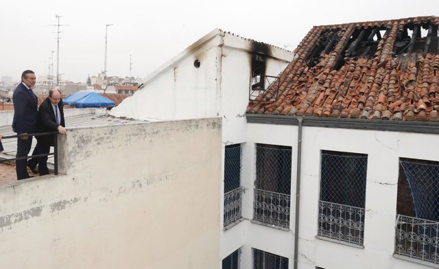 Bomberos del Ayuntamiento de Madrid han revisado los daños estructurales que ha provocado el incendio sofocado en un inmueble colindante al edificio del Tribunal Superior de Justicia de Madrid (TSJM), en el centro de la capital.