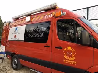 Vehículo del puesto de control instalado en Rascafría por el incendio forestal declarado en la localidad segoviana de La Granja y otro en el municipio madrileño de Miraflores. - EMERGENCIAS 112 COMUNIDAD DE MADRID
