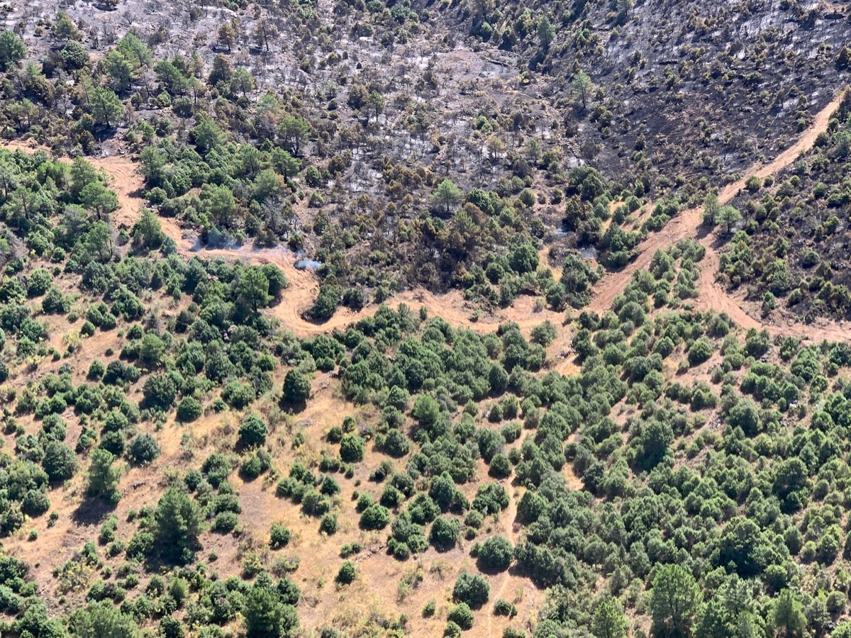 Además, dentro del entorno del incendio hay diferentes poblados y edificaciones agropecurarias. El combustible está formado principalmente por enebros pasto y chaparra, es decir, materiales muy inflamabres y resinosos.