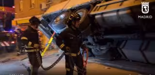 Tras más de tres horas de trabajo y realizando maniobras laboriosas han conseguido enderezar el camión, sujetándolo y acuñándolo con una grúa de Bomberos de Madrid que tenía tonelaje limitado.