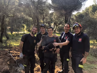 La perra 'Lola' y los bomberos que la rescataron, ya que había quedado atrapada en una madriguera de Majadahonda - COMUNIDAD DE MADRID