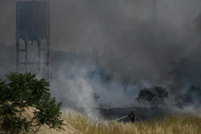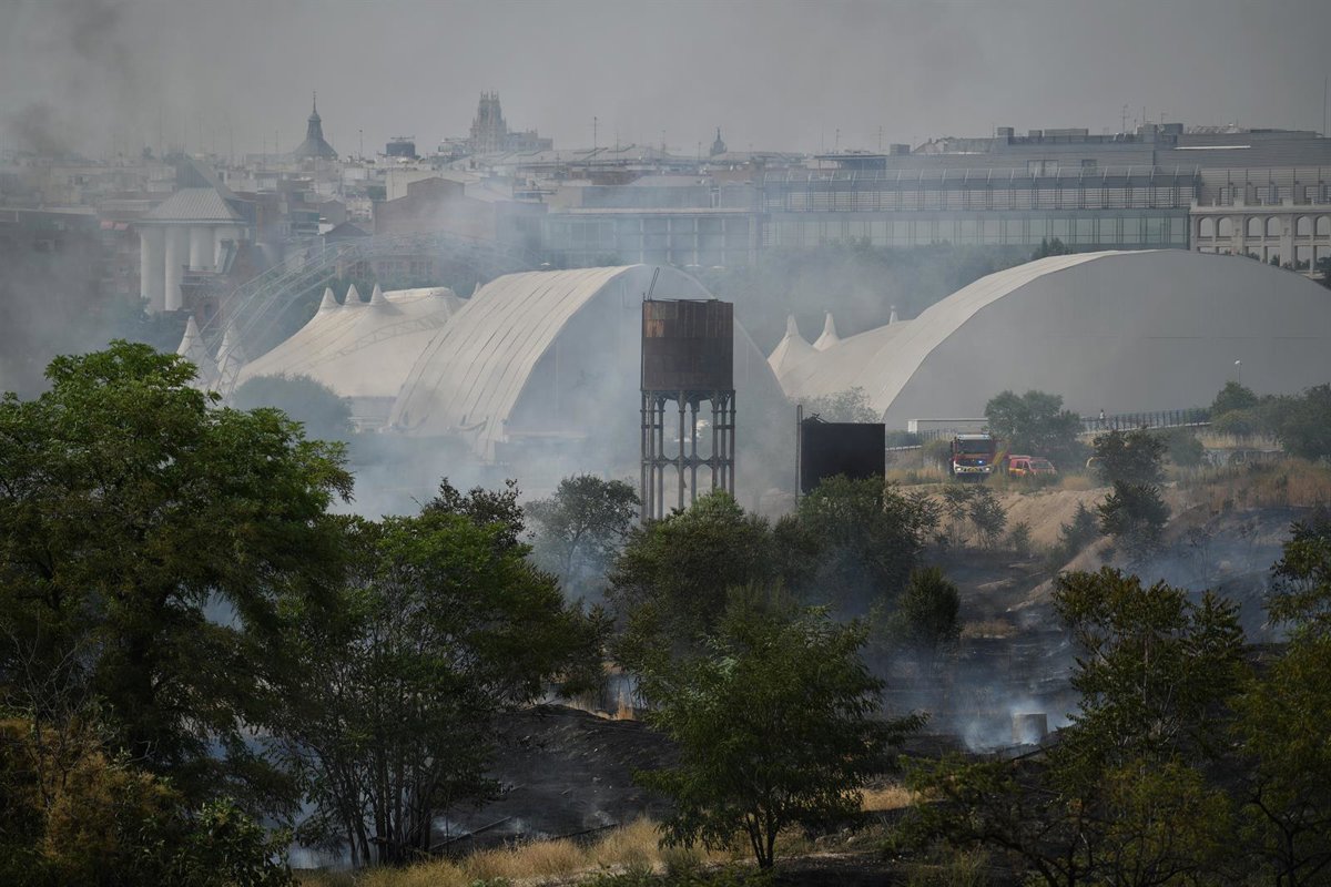 Vista general del humo producido por un incendio en pastos en el madrileño barrio de Delicias, a 13 de junio de 2022, en Madrid (España). - Fernando Sánchez - Europa Press