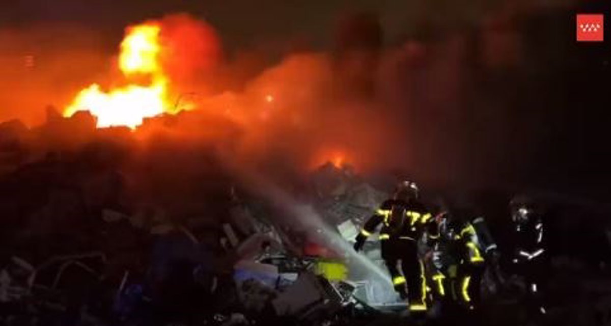Tres dotaciones de Bomberos de la Comunidad de Madrid continúan trabajando durante la madrugada para extinguir un incendio que se ha originado en la tarde de este lunes en una chatarrería en la calle Puerto de Pajares, 12, en Leganés, según ha informado un portavoz de Emergencias 112 Comunidad de Madrid.