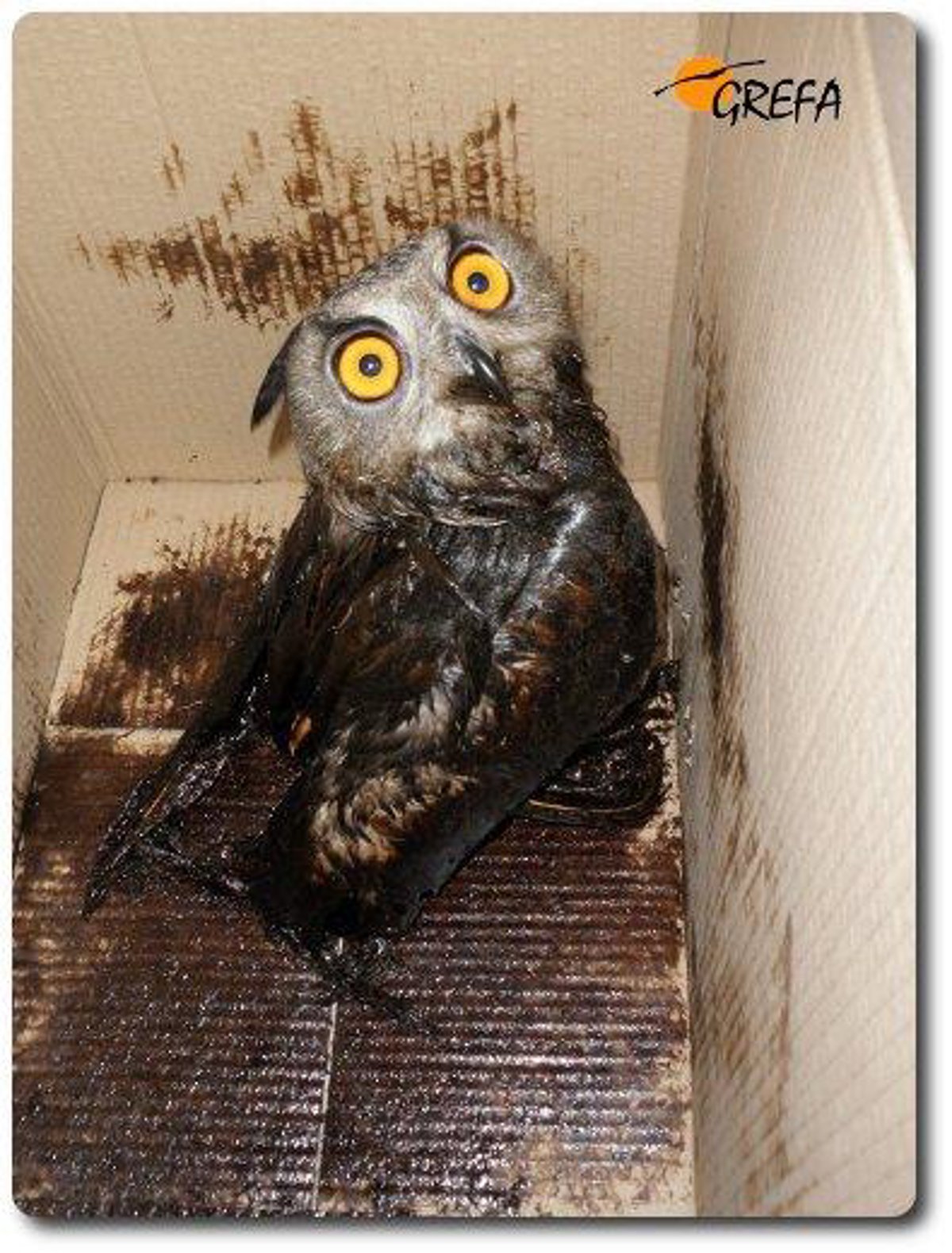 Hace unas semana, la Policía Local de Arganda del Rey encontró un búho real (Bubo bubo) impregnado completamente de aceite. Aunque llegó vivo al Hospital de Grefa, el animal falleció. "Por todo esto volvimos a visitar la charca de aceite para ver si se habían reanudado las obras de restauración, y cómo transcurría todo, pero descubrimos que no había ningún tipo de maquinaria, ni personal, ni señas de restauración y que la 'laguna' continuaba prácticamente igual que años atrás. Incluso desde lejos el olor era asfixiante", señalaron los proteccionistas.