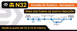 Desde su cabecera en la parada de nueva creación nº 5857 (Avenida de América, 12), la nocturna N32 tomará la A-2 para hacer parada intermedia en Canillejas hasta alcanzar las terminales 1, 2 y 3 del aeropuerto, con paradas en cada terminal, y después proseguir por la Avenida de Logroño, donde efectuará otras tres paradas más antes de continuar circulando hasta su cabecera en la T4.