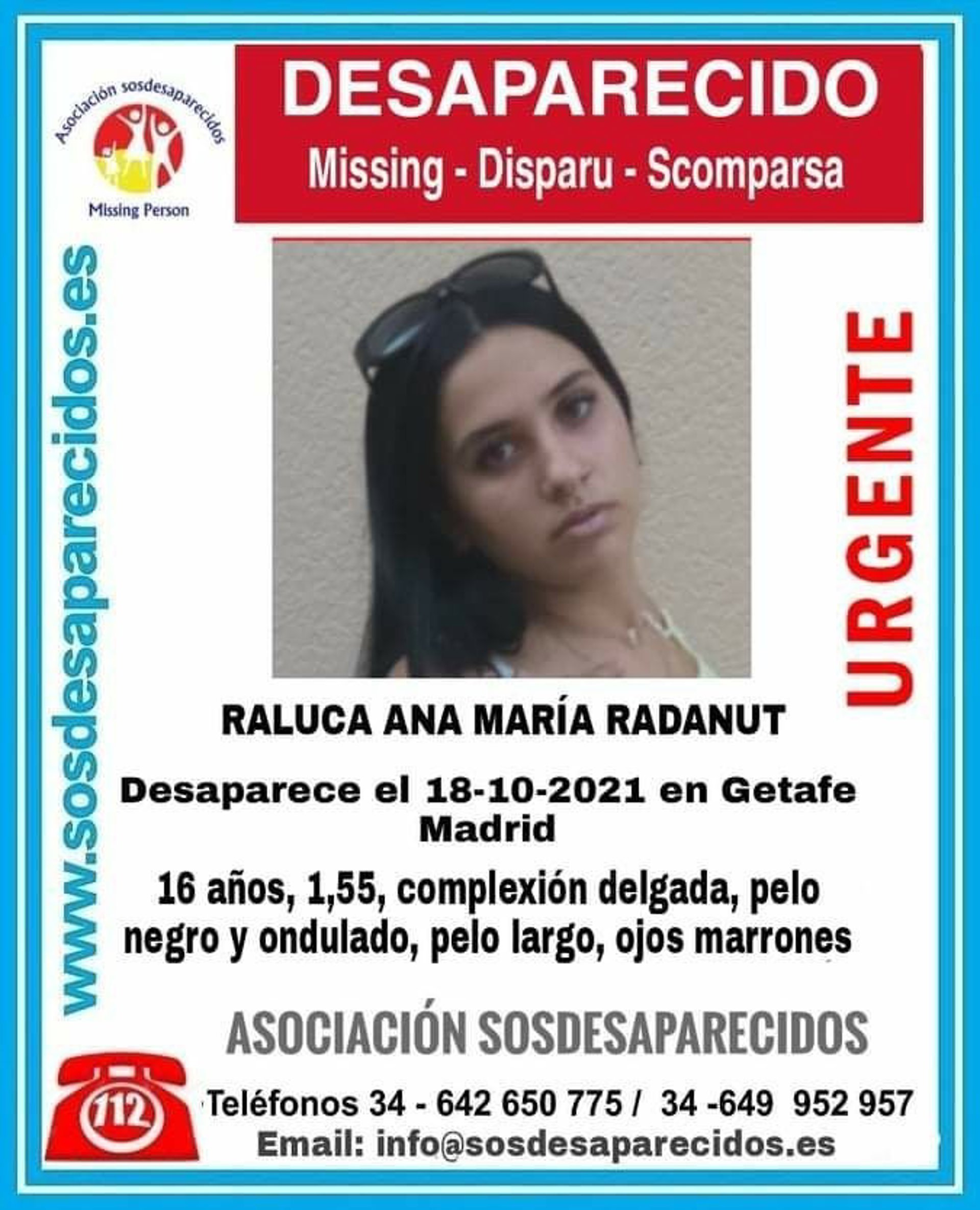 Familiares, amigos, compañeros de clase y Fuerzas de Seguridad buscan desde hace más de dos semanas Raluca Ana María R., una chica de Getafe que desapareció el pasado 18 de octubre, ha alertado hoy viernes SOS Desaparecidos.