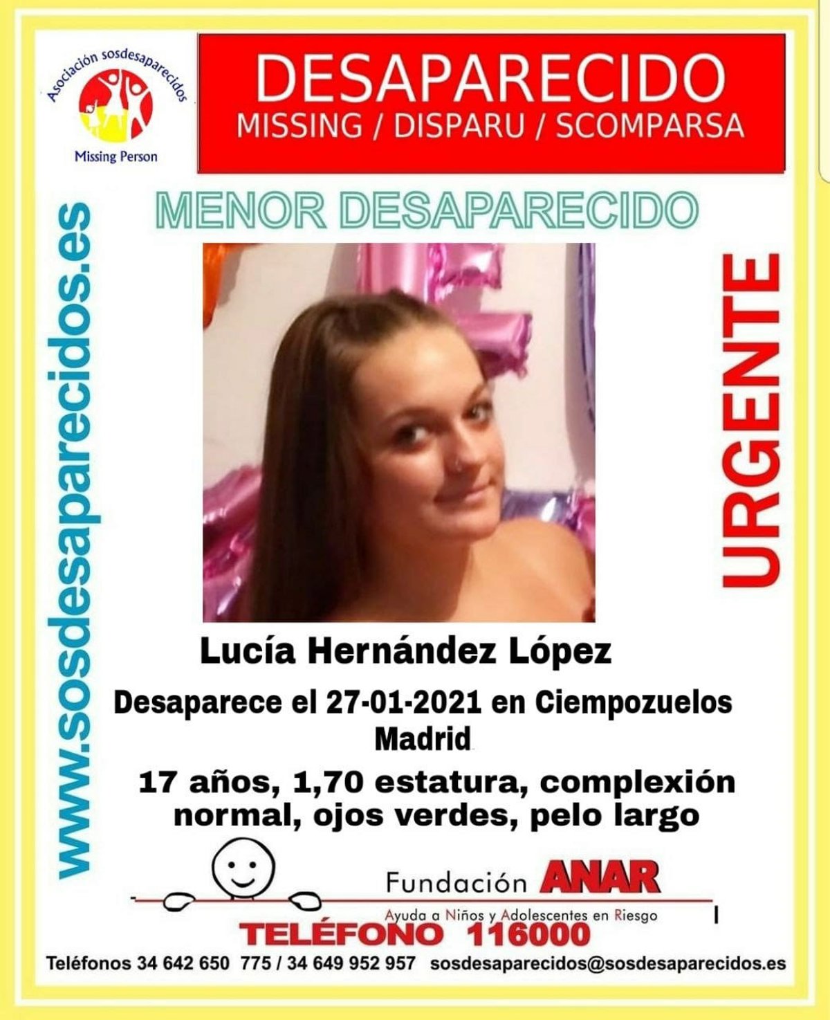 Ante cualquier pista o avistamiento sobre la desaparecida, se puede comunicar en los teléfonos 112 (Emergencias), 061 (Guardia Civil), 116000 (Fundación ANAR) o en los teléfonos habilitados por la asociación de búsqueda de desaparecidos (642 650 775 y 649 952 957)