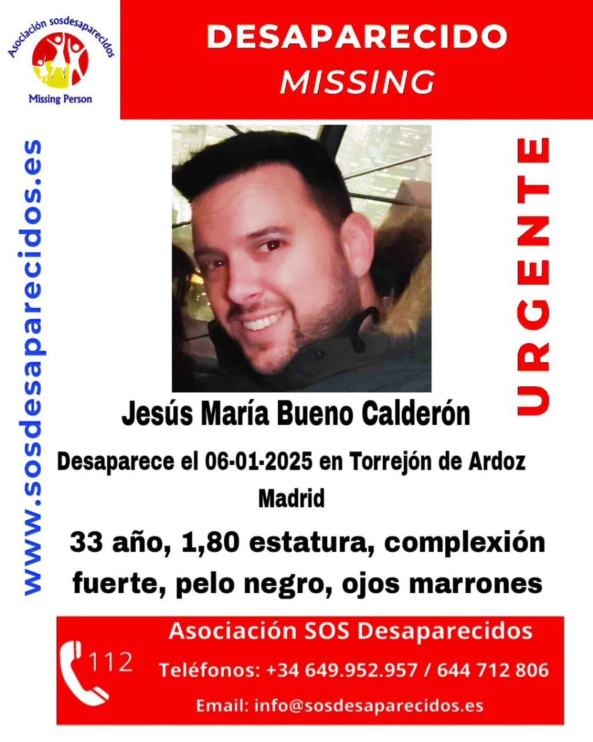 Familiares, amigos, compañeros y Fuerzas y Cuerpos de Seguridad buscan desde ayer, Día de Reyes, a un hombre de 33 años desaparecido en la localidad de Torrejón de Ardoz, según ha alertado hoy la asociación SOS Desaparecidos.