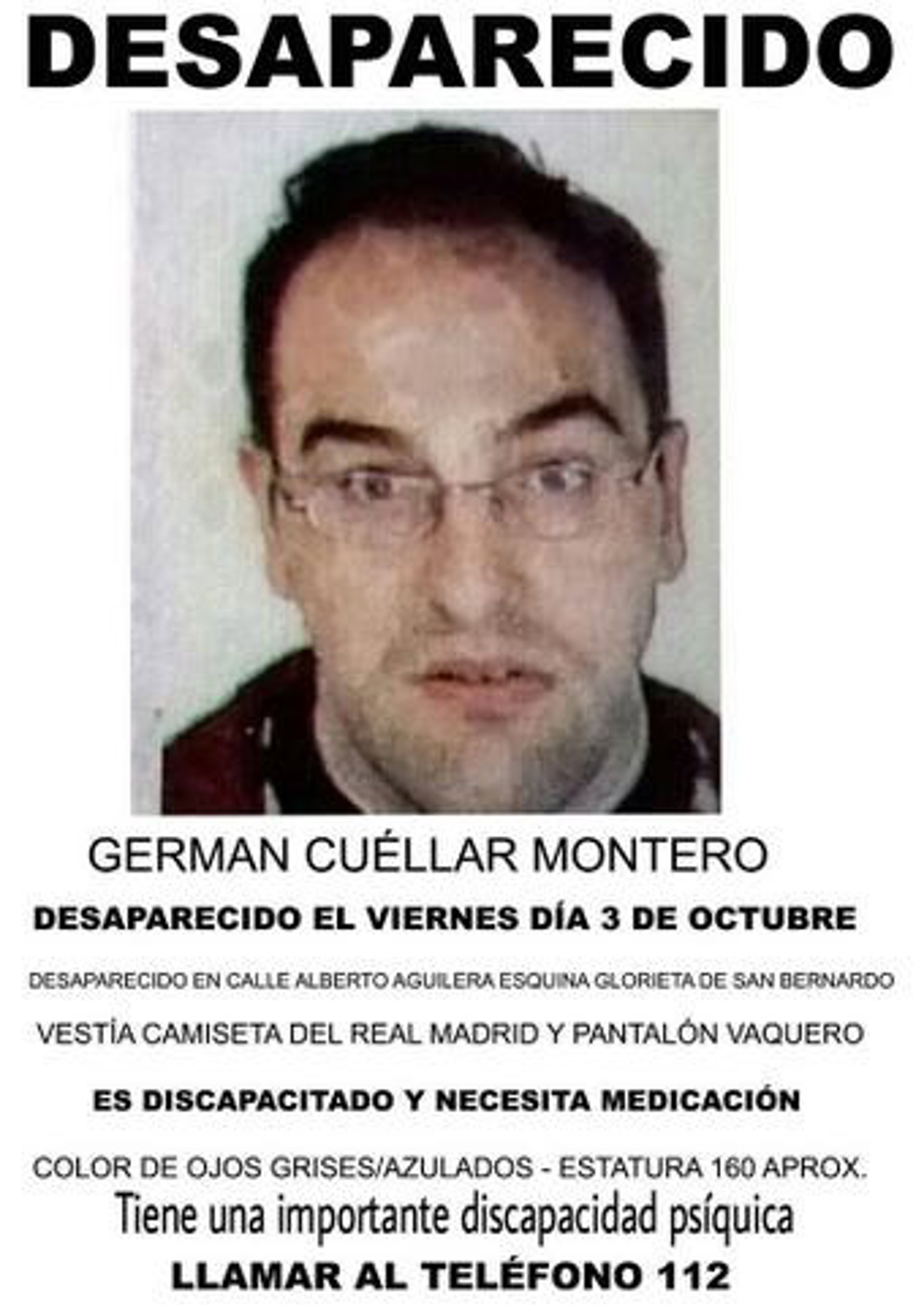 Familiares y amigos buscan desde el viernes a un Germán C.M, un hombre de 39 años, con discapacidad intelectual, que desapareció el viernes en la madrileña glorieta de San Bernardo, han confirmado a Europa Press fuentes policiales.