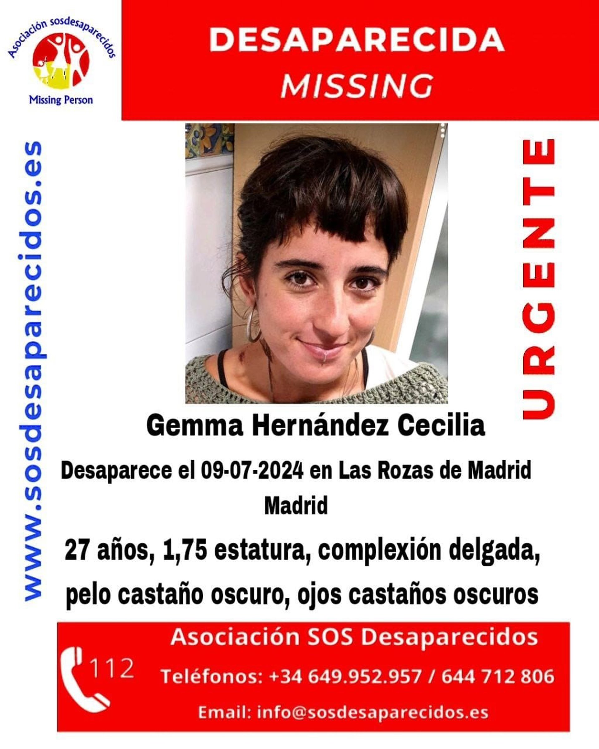 Familiares, amigos y Fuerzas de Seguridad buscan desde hace días a Gemma Hernández Cecilia, una joven de 27 años que se marchó de su casa en la localidad de Las Rozas el 9 de julio y desde entonces se desconoce su paradero, ha informado la asociación SOS Desaparecidos en redes sociales.