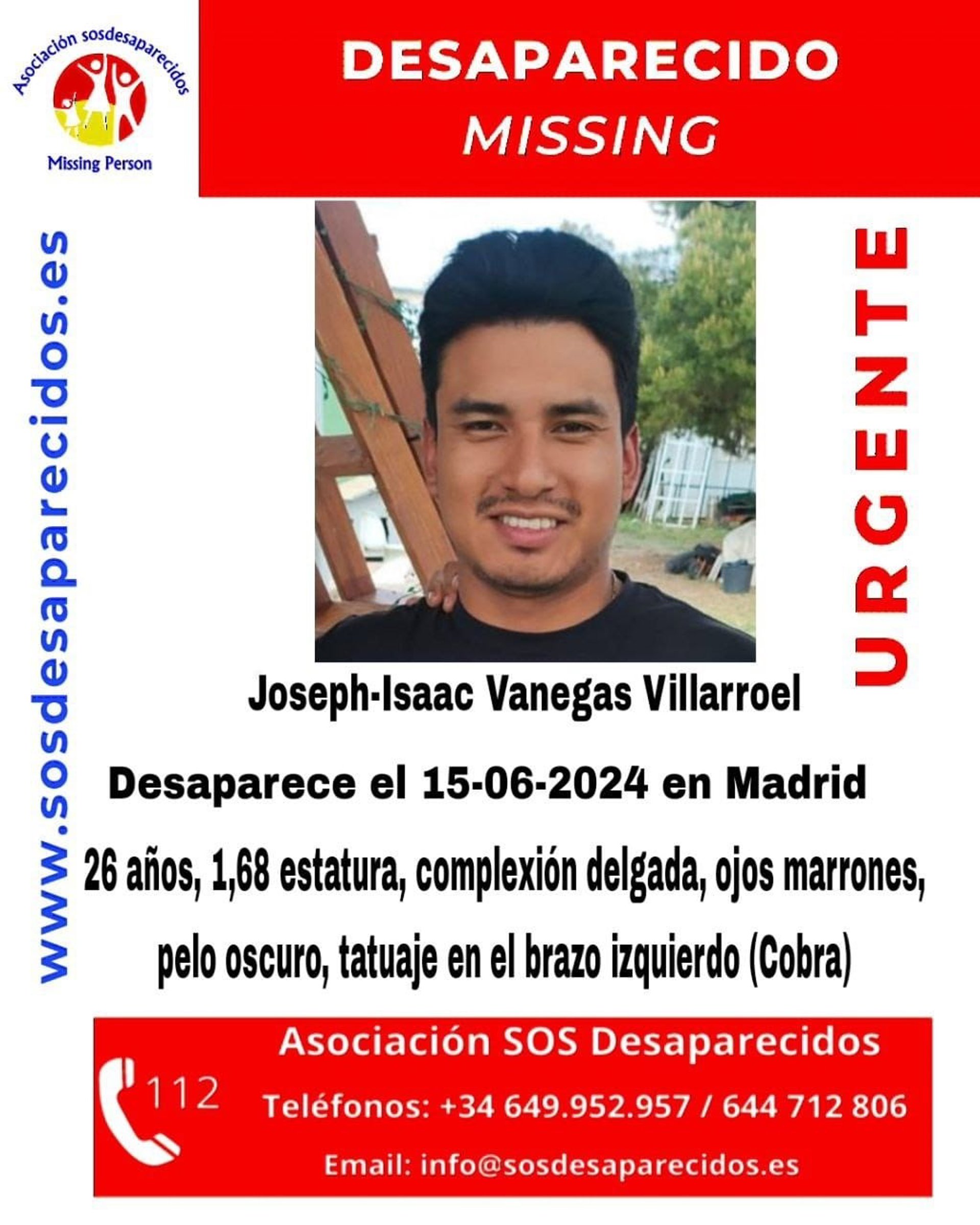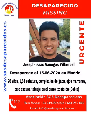 Se trata de Joseph-Isaac Vanegas Villarroel. Mide 1,68 metros de estatura, tiene complexión delgada, ojos marrones, pelo oscuro y un tatuaje en forma de cobra en su brazo izquierdo.