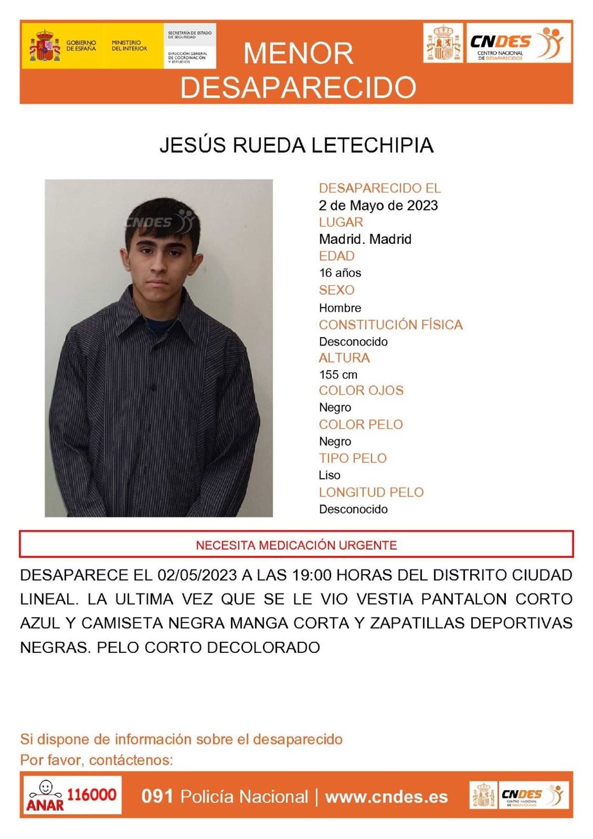 A través de sus redes sociales, el cuerpo ha ofrecido los teléfonos 091, 062 y 112 para transmitir cualquier información sobre Jesús Rueda Letechipia, nombre del menor, al tiempo que ha solicitado difusión para facilitar la localización del menor.