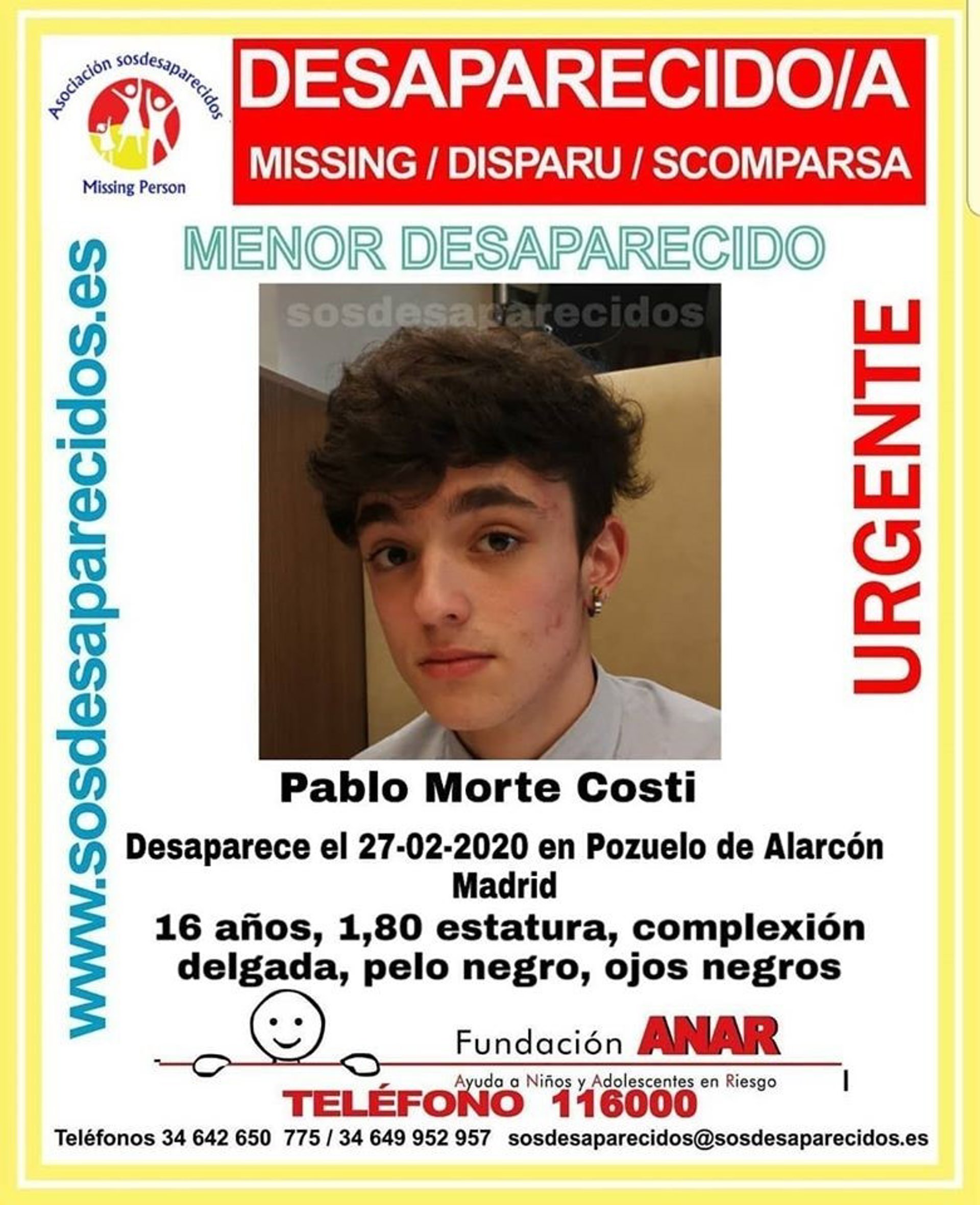 La asociación SOS Desaparecidos ha solicitado la colaboración ciudadana a través de sus redes sociales para localizar a Pablo Morte Costi, un varón de 16 años desaparecido en Pozuelo de Alarcón el pasado 27 de febrero.