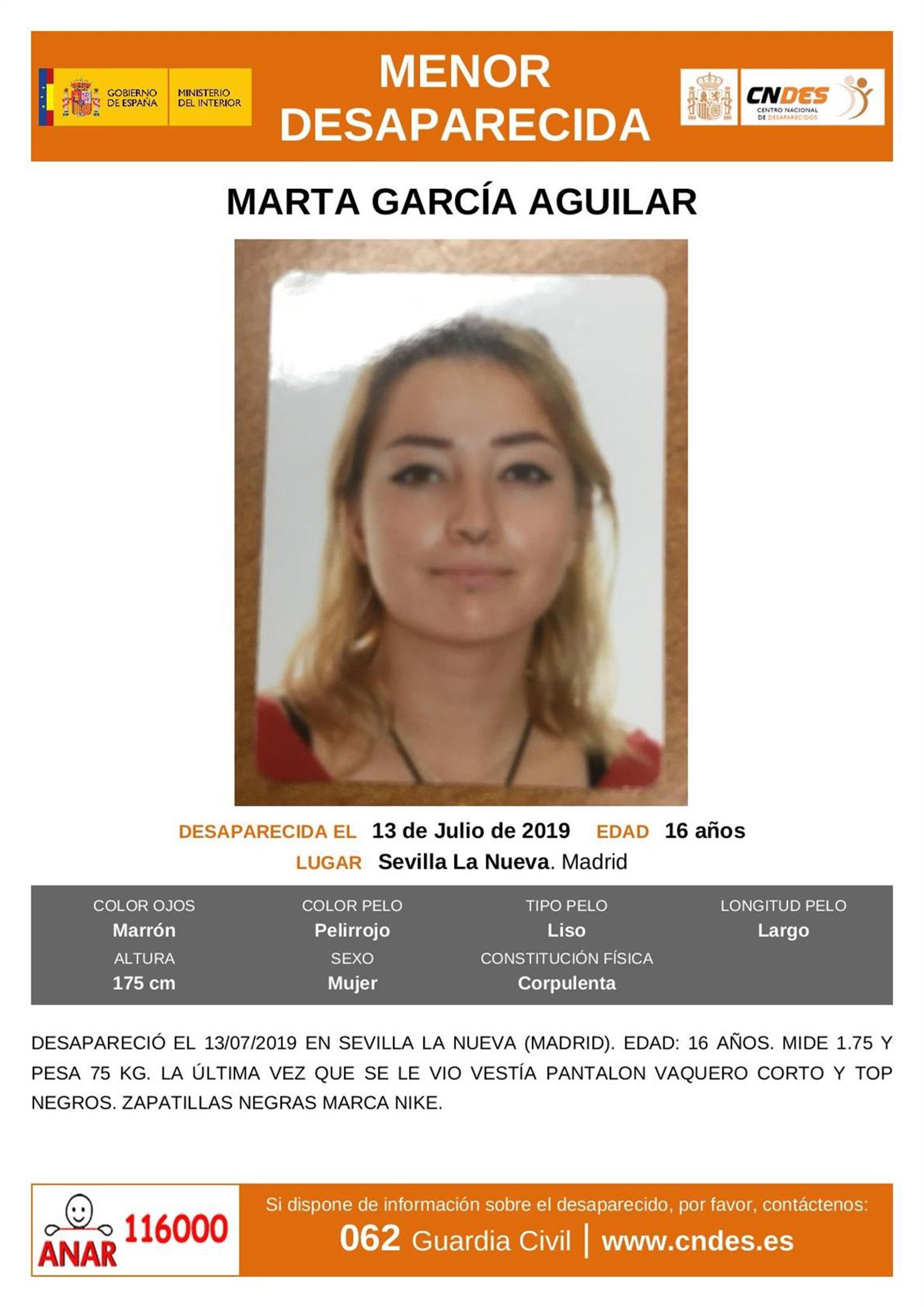 La chica, identificada como Marta García Aguilar, mide 1,75 metros, es de complexión corpulenta y pesa unos 75 kilos, es pelirroja de pelo largo y tiene los ojos marrones, según la descripción facilitada en redes sociales.