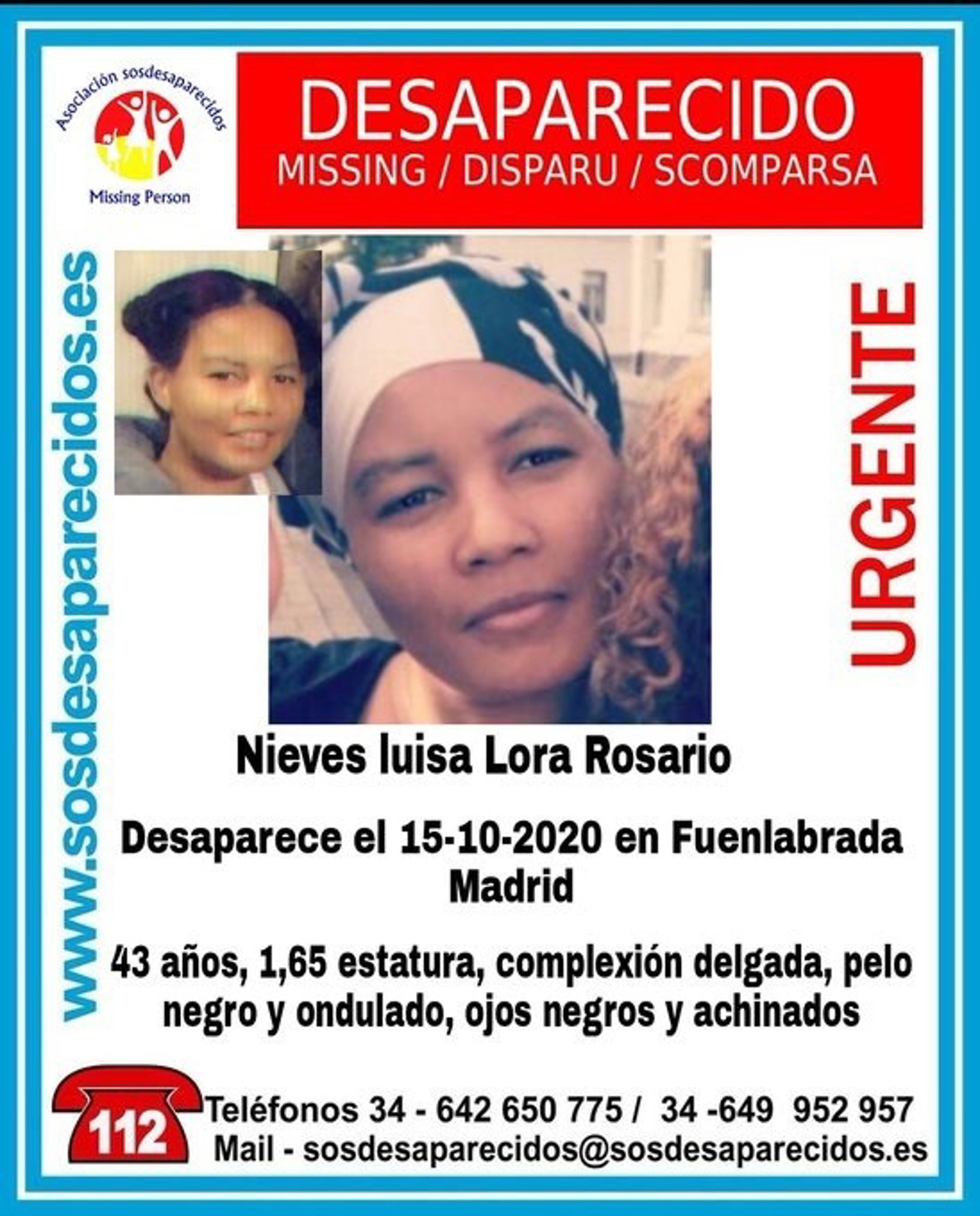 La asociación 'SOS Desaparecidos' ha activado la alerta por la desaparición de una mujer de 43, Nieves Luisa Lora Rosario, desde el pasado 15 de octubre en Fuenlabrada.
