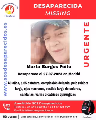 Amigos, vecinos y familiares buscan desde el pasado 27 de julio a Marta Burgos Feito, una mujer de 49 años que desapareció ese día sin dejar rastro ni comunicación, ha informado la asociación SOS Desaparecidos.