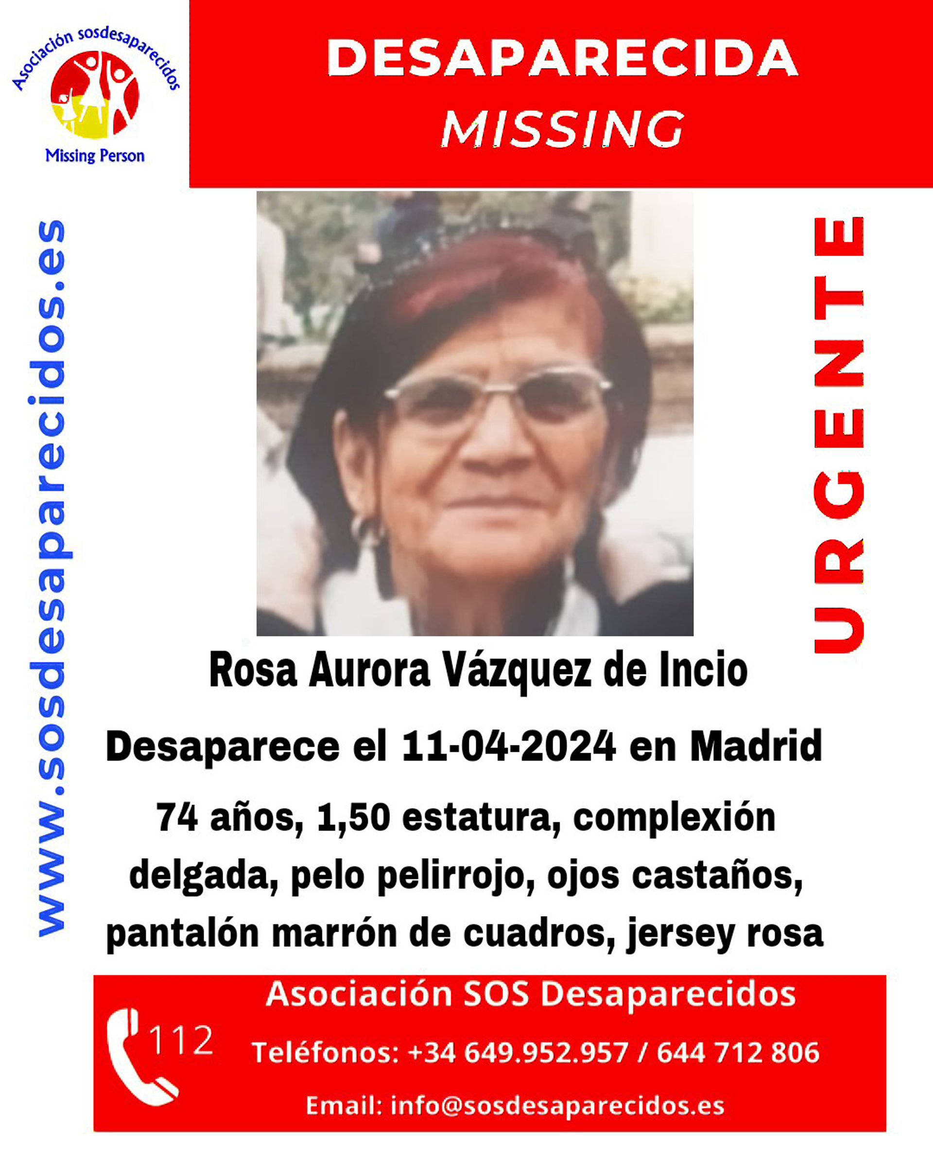 La descripción facilitada por SOS Desaparecidos indica que Rosa Aurora mide metro y medio, es de complexión delgada, tiene cabello pelirrojo, ojos castaños y, en el momento de su desaparición, vestía pantalón marrón de cuadros y jersey rosa.