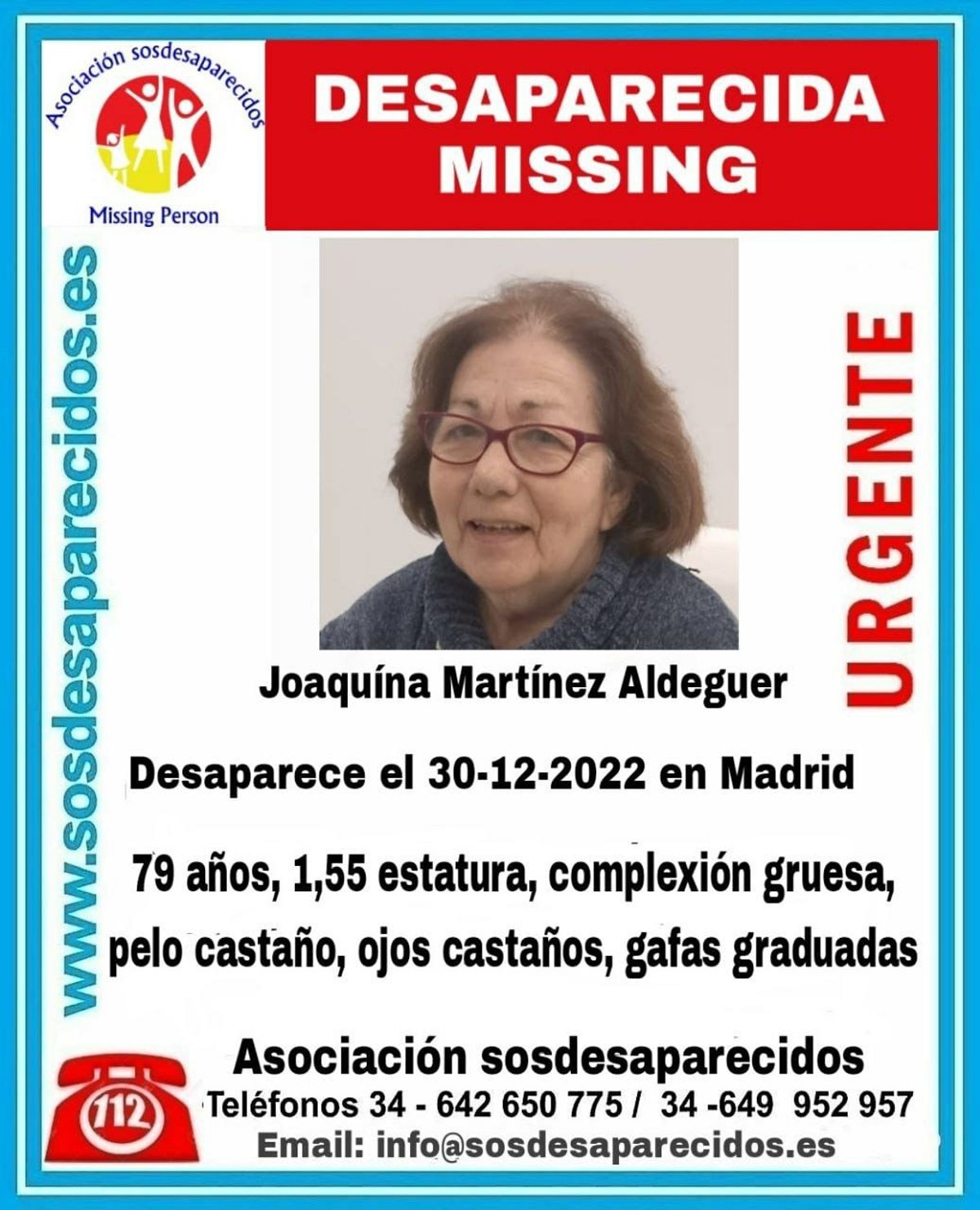 La mujer se llama Joaquina Martínez Aldeguer. Mide 1,55 metros de estatura, tiene complexión gruesa, pelo castaño, ojos marrones y usa gafas graduadas.