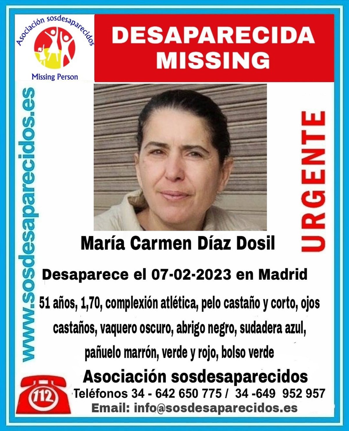La Policía Municipal de Madrid y SOS Desaparecidos han pedido colaboración para dar con el paradero de María del Carmen Díaz Dosil, una mujer de 51 años que desapareció en la capital de España el pasado martes 7 de febrero.