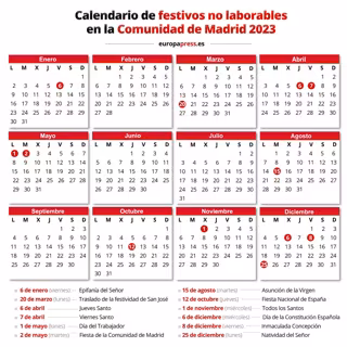 La Comunidad de Madrid tendrá 8 festivos nacionales y 4 festivos regionales en el año 2023. Además de ellos, cada municipio de la región dispondrá de dos festivos de carácter local que determinarán los propios ayuntamientos.