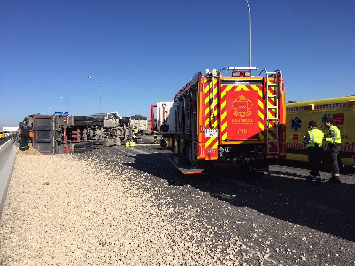 Un camión cargado de grava ha volcado sobre las 11.45 horas en el kilómetro 27 de la A-4, a la altura de Valdemoro, y ha provocado que parte de la carga se haya esparcido por la calzada.