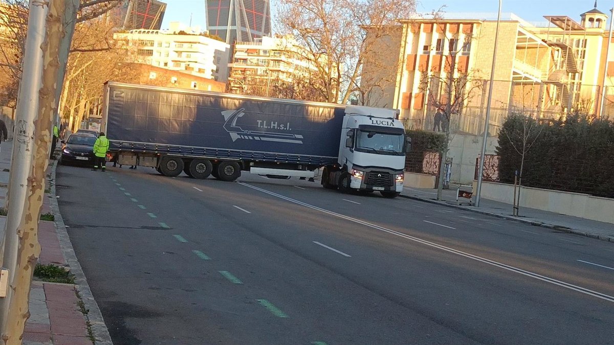 Un camión de gran tonelaje ha quedado atravesado la mañana de este jueves en la calle Fray Bernardino Sahagún, en el distrito de Chamartín, bloqueando durante más de 20 minutos los cuatro carriles de la vía.