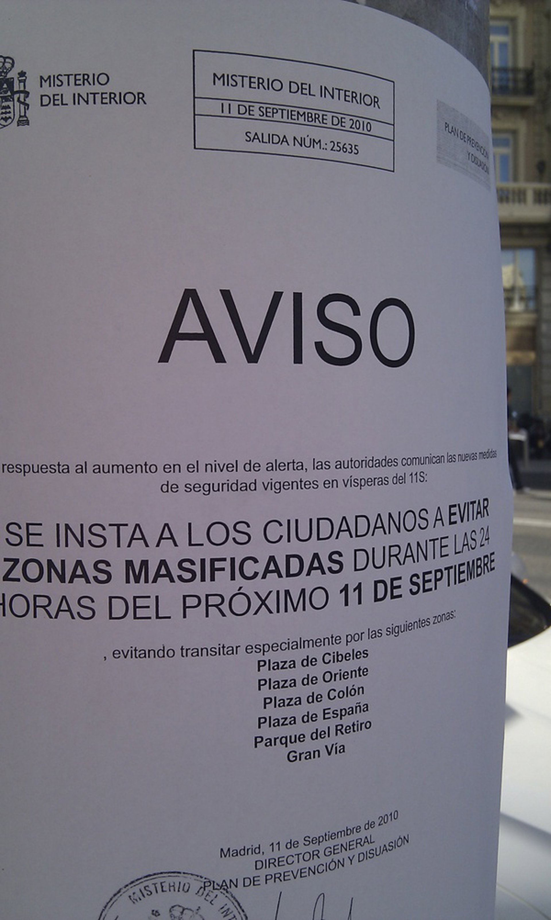 "En respuesta al aumento en el nivel de alerta, las autoridades comunican las nuevas medidas de seguridad vigentes en vísperas del 11S: se insta a los ciudadanos a evitar las zonas masificadas durante las 24 horas del próximo 11 de septiembre, evitando transitar especialmente por las siguientes zonas: plaza de Cibeles, plaza de Oriente, plaza de Colón, plaza de España, Parque de El Retiro y Gran Vía", reza el cartel, que tiene membrete de Interior y firma del director general del Plan de Prevención y Disuasión.