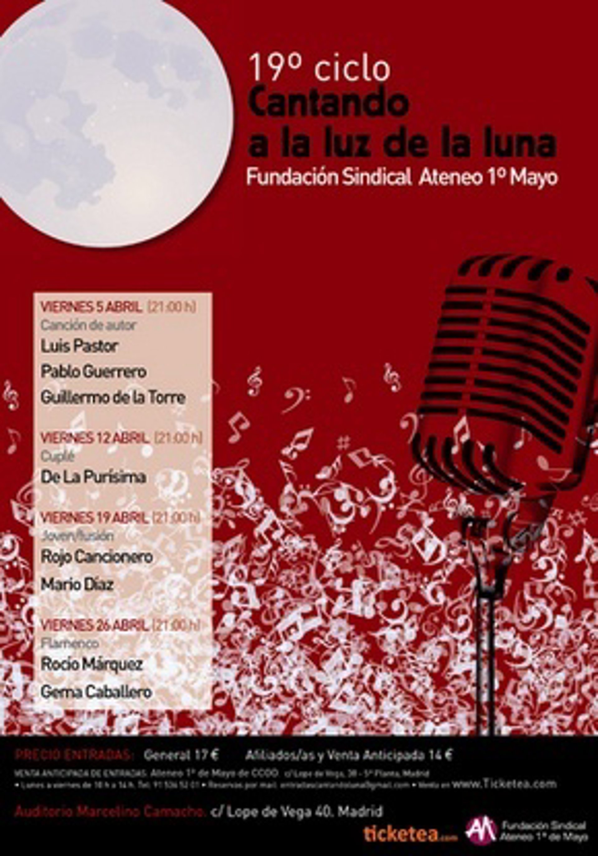 Todos los conciertos tendrán lugar a partir de las 21 horas. El precio de las entradas será de 14 euros para los afiliados a CC.OO y para aquellos que la adquieran de manera anticipada. En taquilla tendrán un precio de 17 euros. Las reservas pueden hacerse en entradascantandolaluna@gmail.com o en el 91 536 52 01.