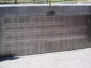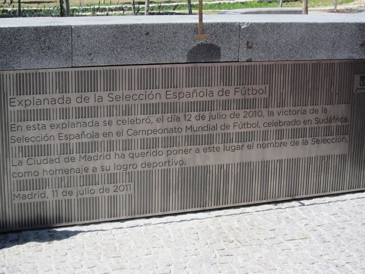 En ella se puede leer: 'Explanada de la Selección Española de Fútbol. En esta explanada se celebró, el día 12de julio de 2010, la victoria de la Selección Española en el Campeonato Mundial de Fútbol, celebrado en Sudáfrica. La Ciudad de Madrid ha querido poner a este lugar el nombre de la Selección, como homenaje a su logro deportivo. Madrid, 11 de julio de 2011'.