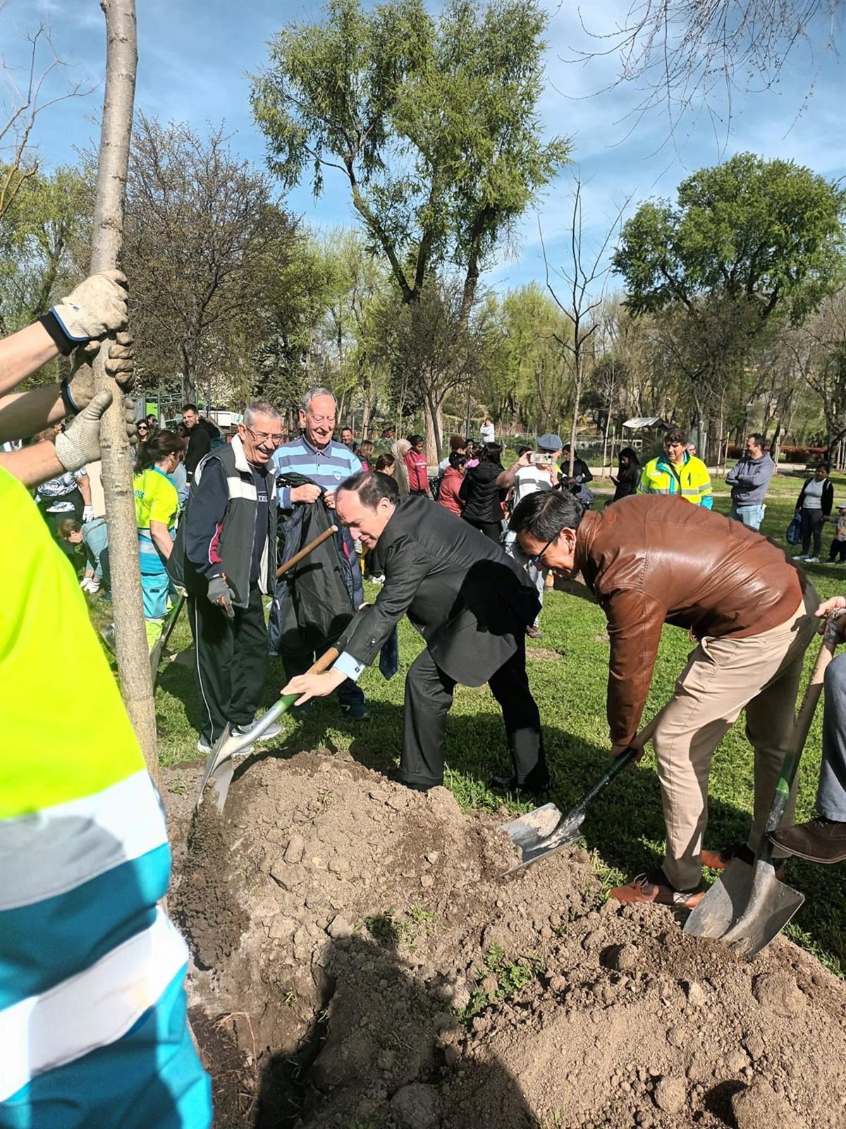 El delegado de Urbanismo, Medio Ambiente y Movilidad, Borja Carabante, ha cogido la pala para unirse a las 225 personas que han participado en una plantación intergeneracional en el parque Dehesa Boyal de Villaverde, que ya cuenta con 55 árboles más.