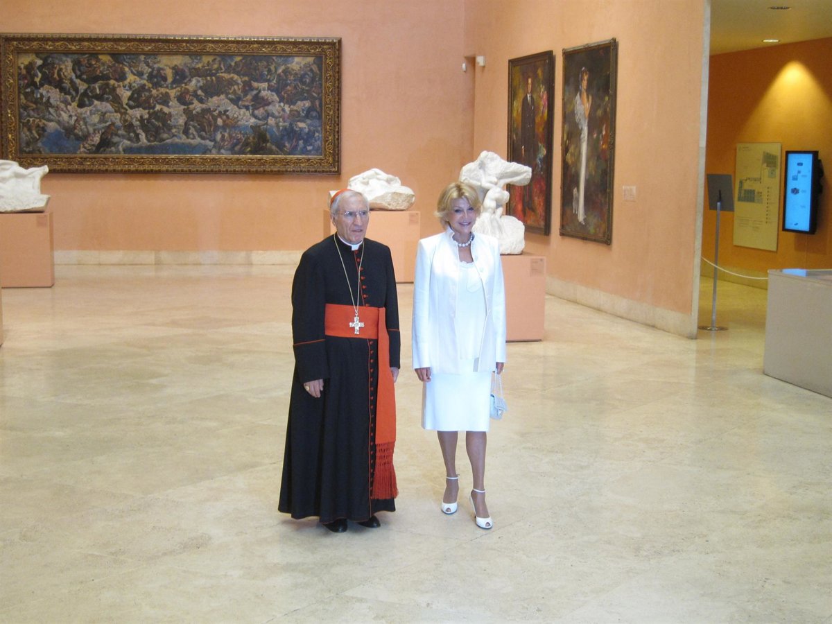 El cardenal arzobispo de Madrid, Antonio María Rouco Varela, y la baronesa Thyssen han inaugurado la exposición 'Encuentros', sobre escenas de la vida de Cristo desde su infancia hasta su resurrección, organizada por la pinacoteca madrileña con motivo de la Jornada Mundial de la Juventud (JMJ).
