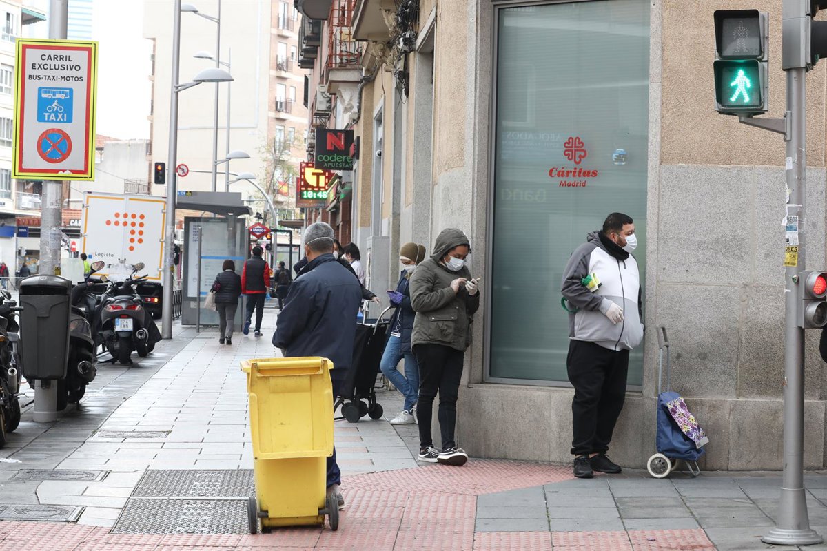 Archivo - Un fila de personas espera a entrar en el economato solidario de Cáritas situado en la calle Bravo Murillo de Madrid durante el inicio de la cuarta semana del estado de alarma decretado a consecuencia del coronavirus. - Marta Fernández - Europa Press - Archivo