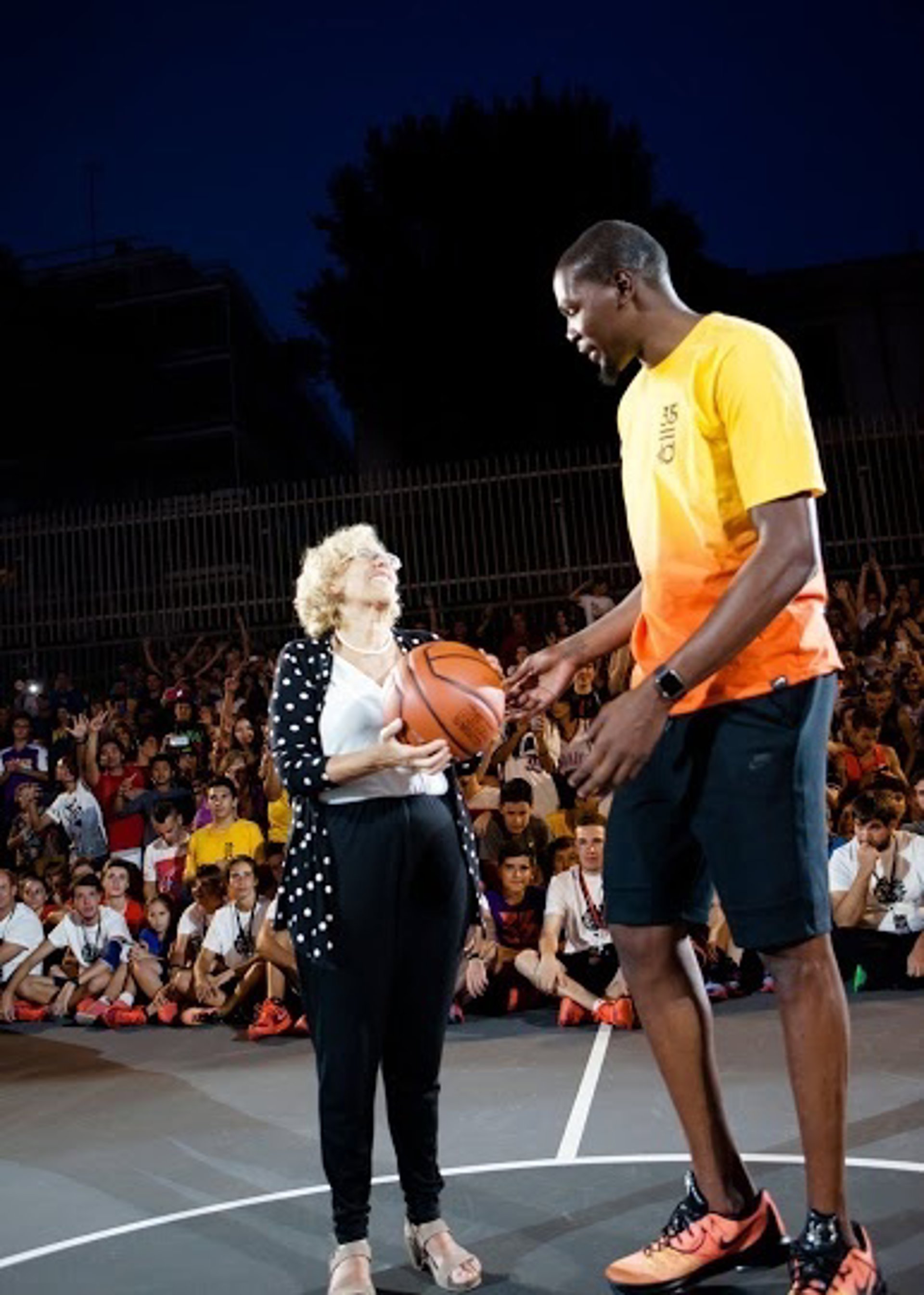 La alcaldesa de Madrid, Manuela Carmena, acudió este sábado a la cancha de baloncesto del Parque Casino de la Reina de Lavapiés para dar la bienvenida al jugador de la NBA Kevin Durant, que lleva varios días en la ciudad por una campaña de promoción de la marca deportiva que le patrocina.