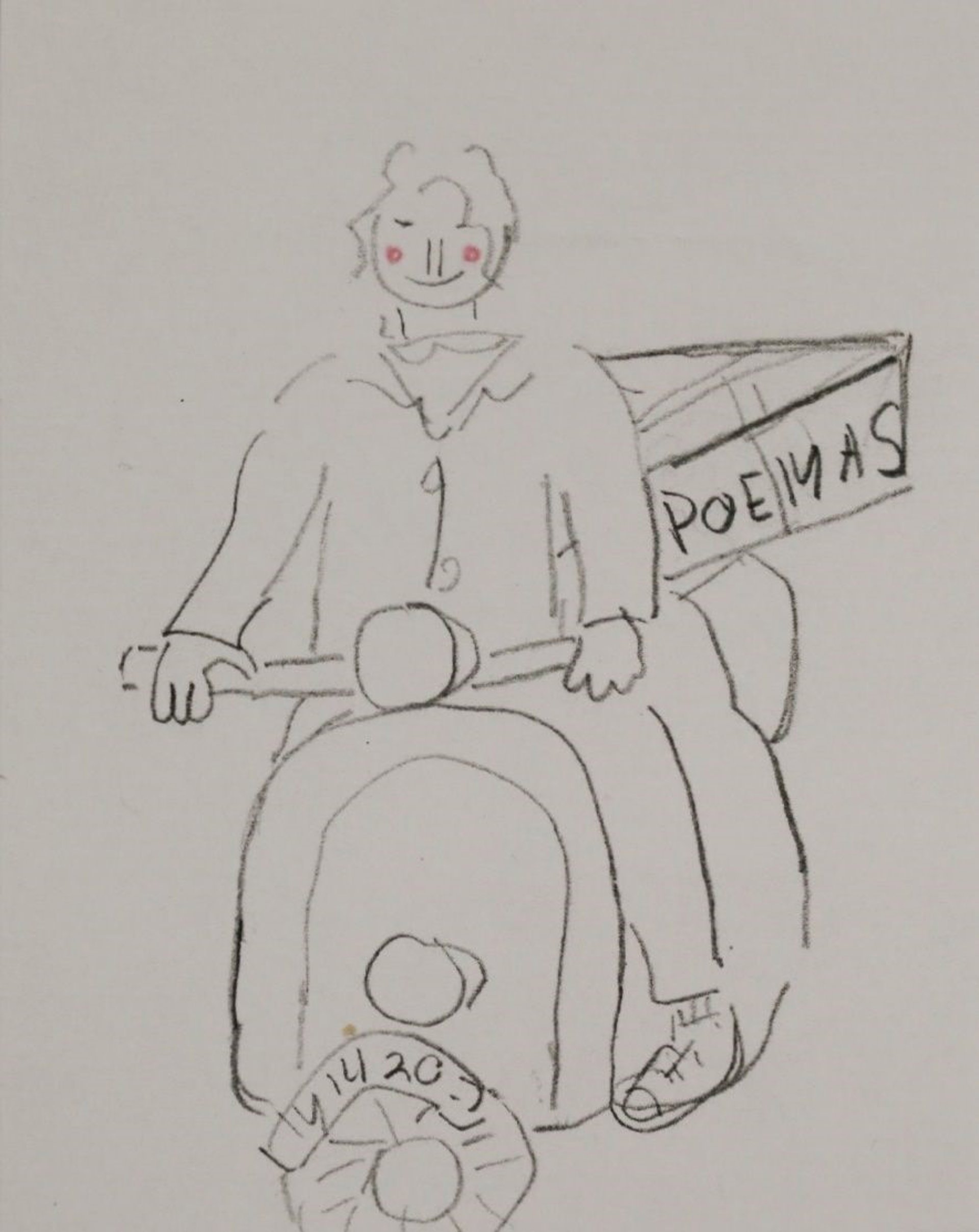 La carta se acompaña por un dibujo, hecho a mano por ella, en el que aparece Gloria Fuertes montada en una moto cargada con sus poemas. Les explica que "le gustaba mucho montar en su moto y recorrer los barrios y pueblos de Madrid". Se despide de los niños deseando que sigan escribiendo y les envía "un beso grande".