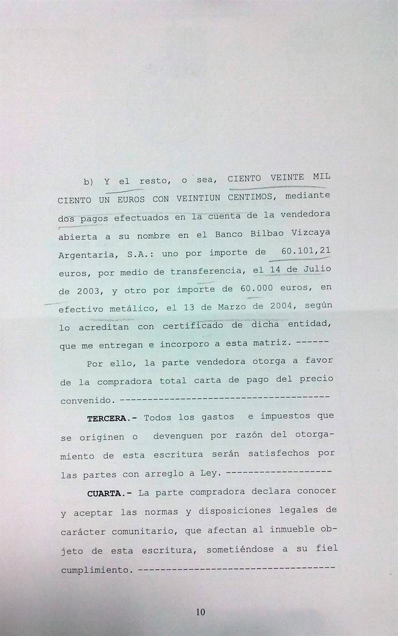Dicha cantidad, 180.101 euros, se distribuyó en dos partes, ha detallado. La primera, de 60.000 euros, es a la que el notario se refiere como pago en metálico, ha expuesto. Se trata de un ingreso en la cuenta bancaria del BBVA de la vendedora realizada el 5 de noviembre de 2003, como quedó acreditado mediante certificado bancario. "No alude al pago en metálico sino a un ingreso en cuenta de la vendedora", ha remarcado.