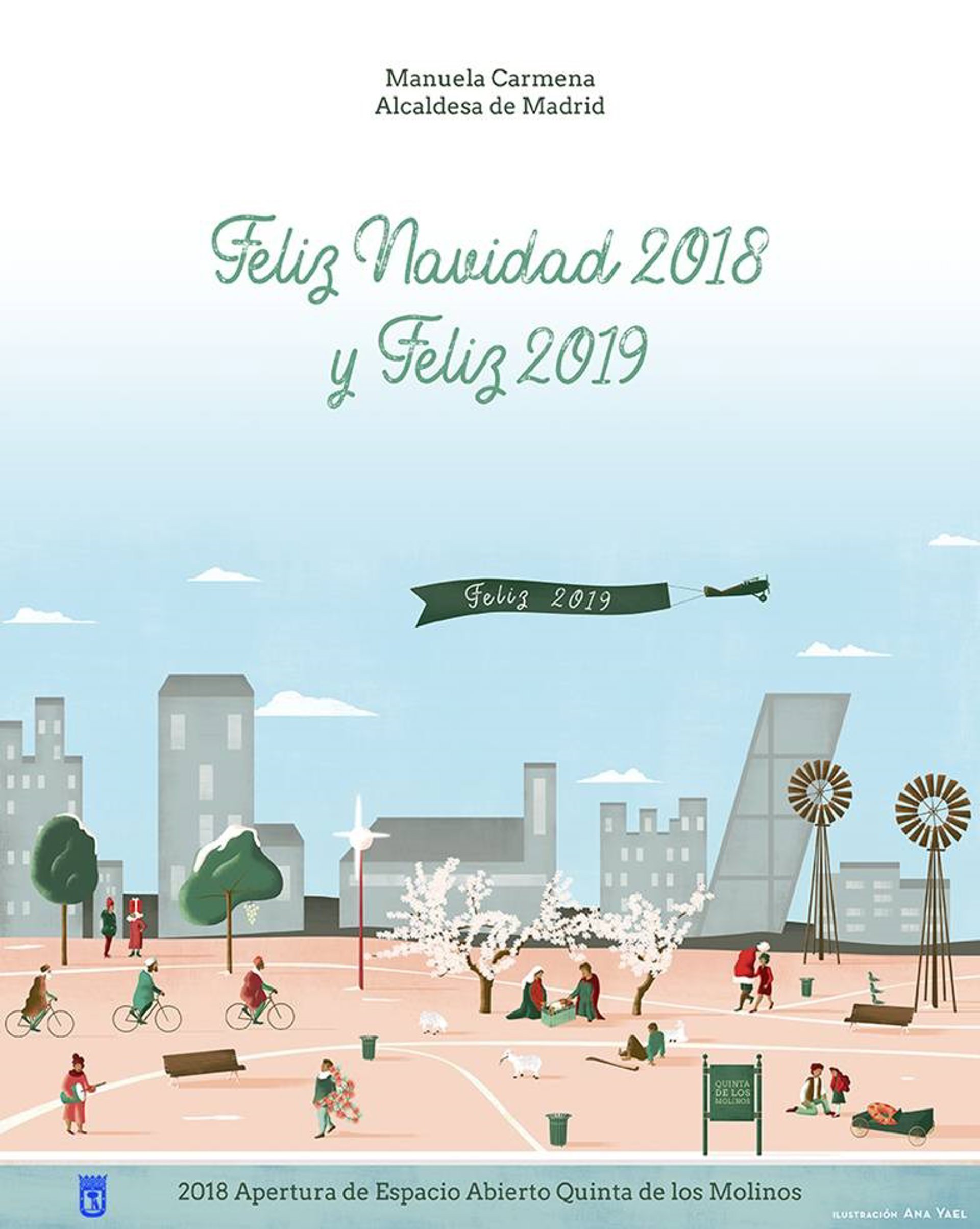 La escena, con bancos y papeleras, como todo parque de Madrid que se precie de serlo, se completa con una avioneta que desde el cielo madrileño despliega una pancarta en la que se lee 'Feliz 2019'. Por encima de la ilustración unas palabras de Manuela Carmena, 'Feliz Navidad 2018 y Feliz 2019'.