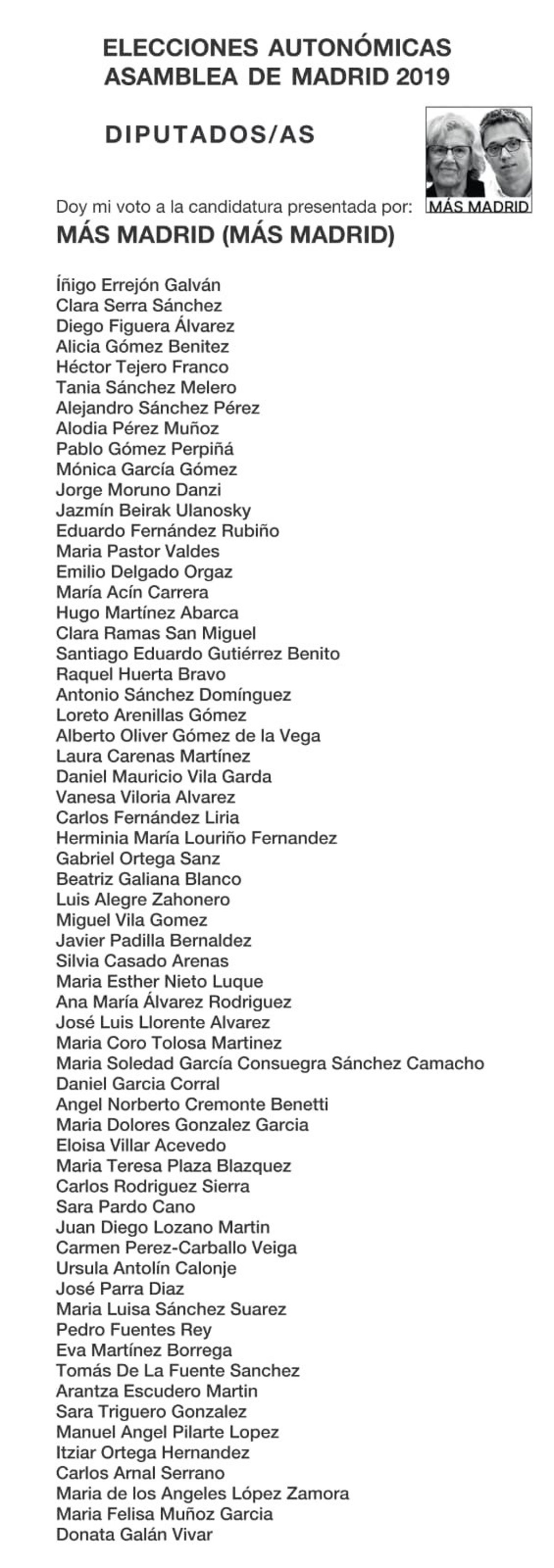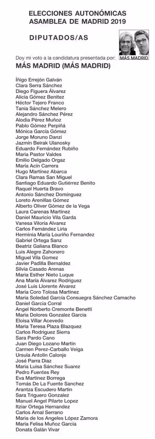 Tanto en la papeleta al Ayuntamiento como a la de la Asamblea, se puede ver la imagen de los dos en la parte superior de la derecha, junto al nombre de Más Madrid, con el listado de candidatos.