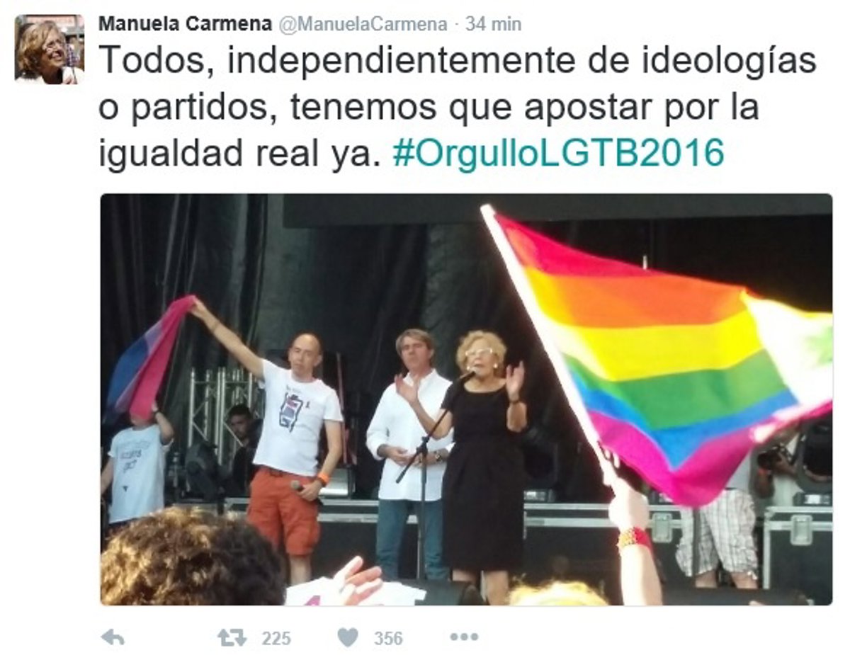 La alcaldesa de Madrid, Manuela Carmena, ha pedido desde el escenario que ha sido instalado en la plaza de Colón que " la igualdad sea real ya, sin temor y que se pueda visualizar la bisexualidad", denunciando todo ataque homófobo y contra los derechos humanos y la libertad sexual.