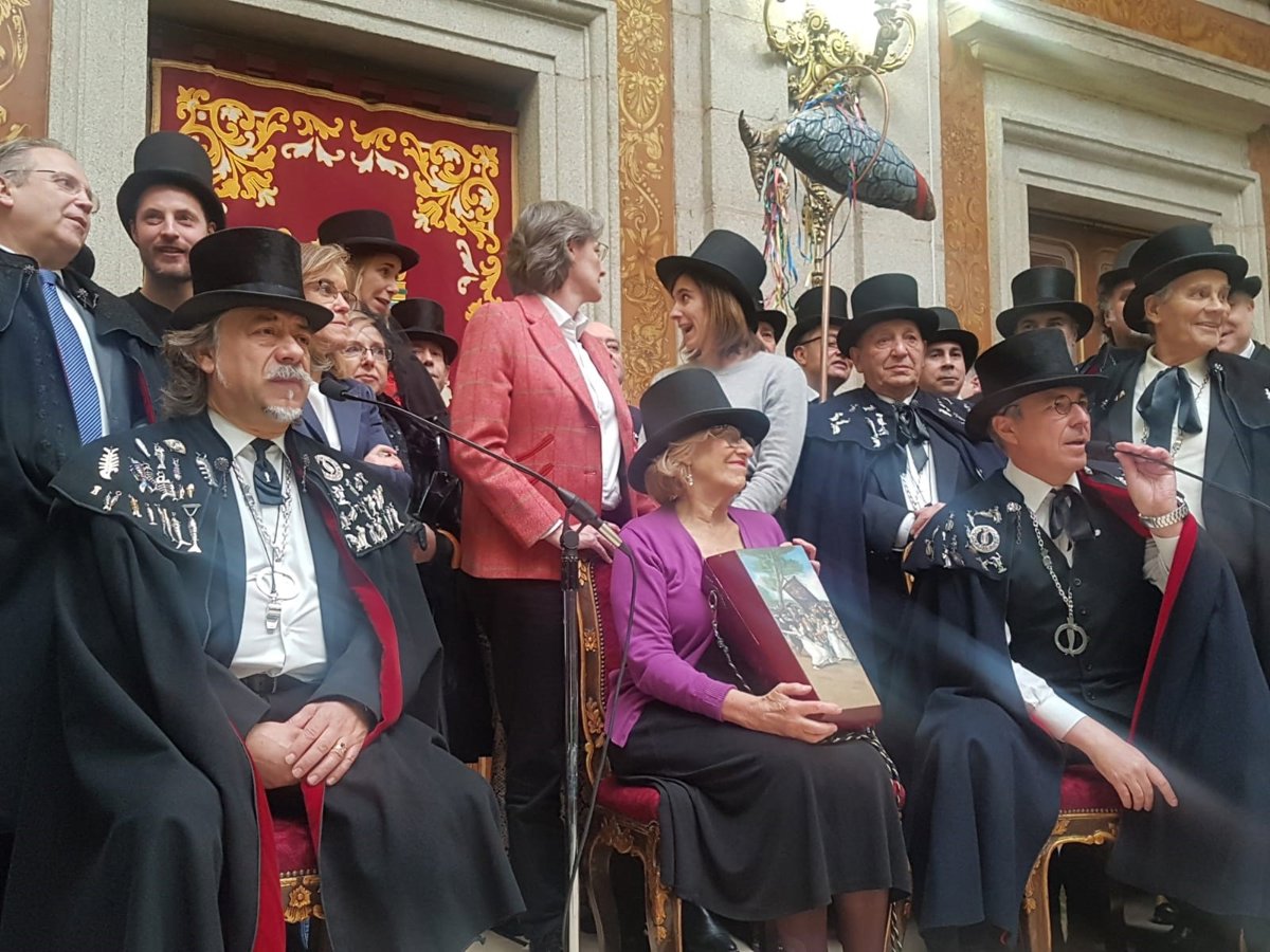 Carmena ha recibido en la Plaza de la Villa a la Alegre Cofradía que esta tarde enterrará a la sardina y pondrá fin a los carnavales para dar paso a la Cuaresma. Carmena --ha sido investida con la sardina en patinete, un pin que se ha colado en la solapa porque, como le han explicado, ya no se puede circular en coche por Madrid Central-- se ha marchado sin aclarar a los periodistas qué son para ella esos regalos envenenados.